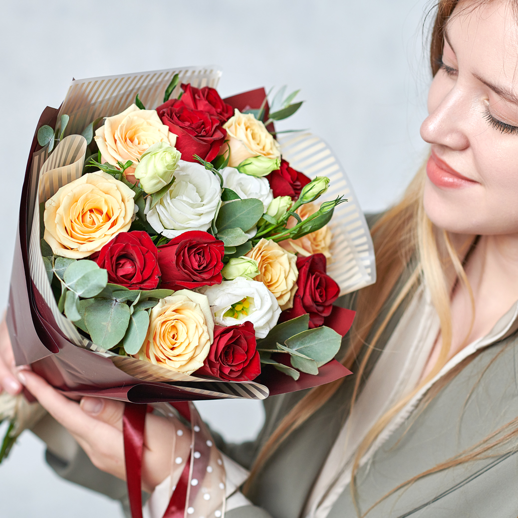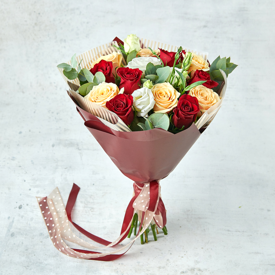 Классика выбора на все времена. Безупречное сочетание кенийских роз душистого эвкалипта в контрастной упаковке. Возможны небольшие изменения элементов. Общий вид и композиция букета будет сохранена. Букет из роз и эустом.