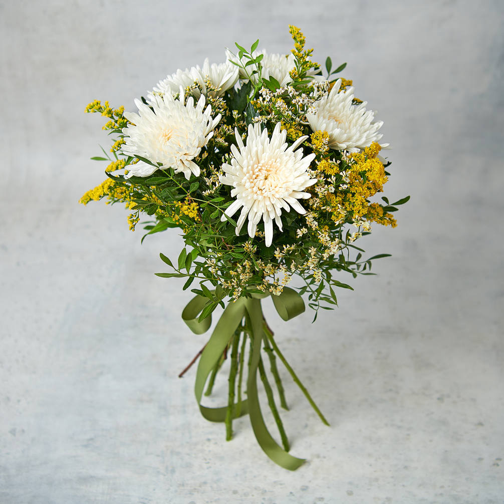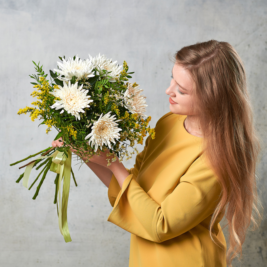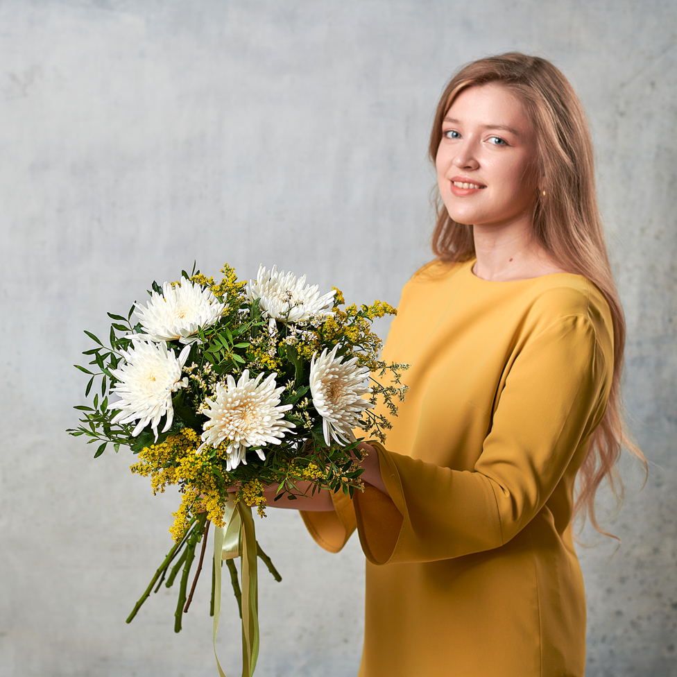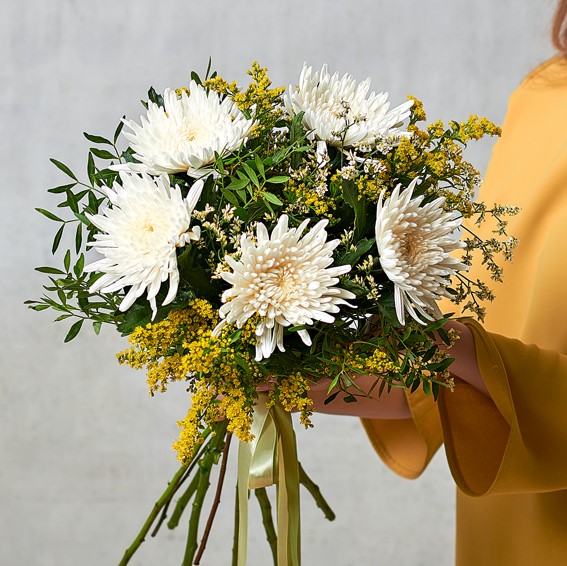 Полевая тематика с нежнейшей классикой в виде крупных звезд хризантемы "Анастасия". Такой букет подойдет тонким и нежным натурам, подчеркнут их легкость и задорность.