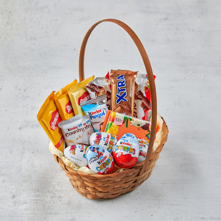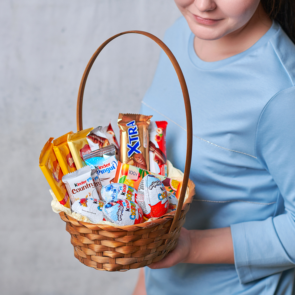 Целая корзина шоколадных сюрпризов. Идеальный вариант подарка как для ребенка, так и для взрослого, ведь так приятно получать знаки внимания в любом возрасте. Возможны небольшие изменения элементов. Общий вид и композиция букета будет сохранена.