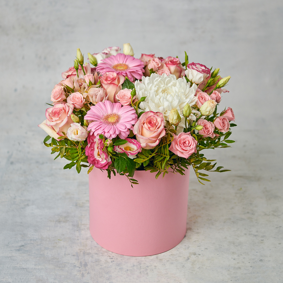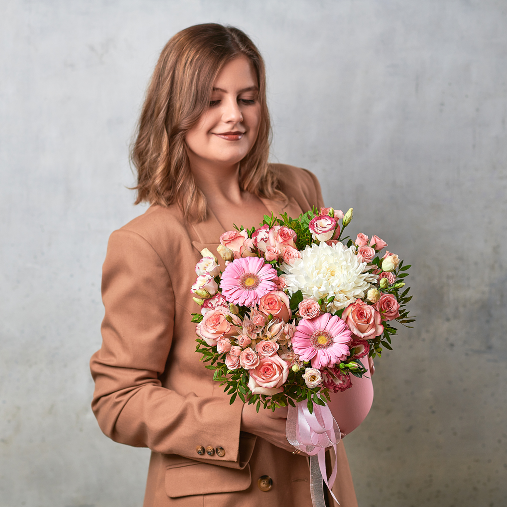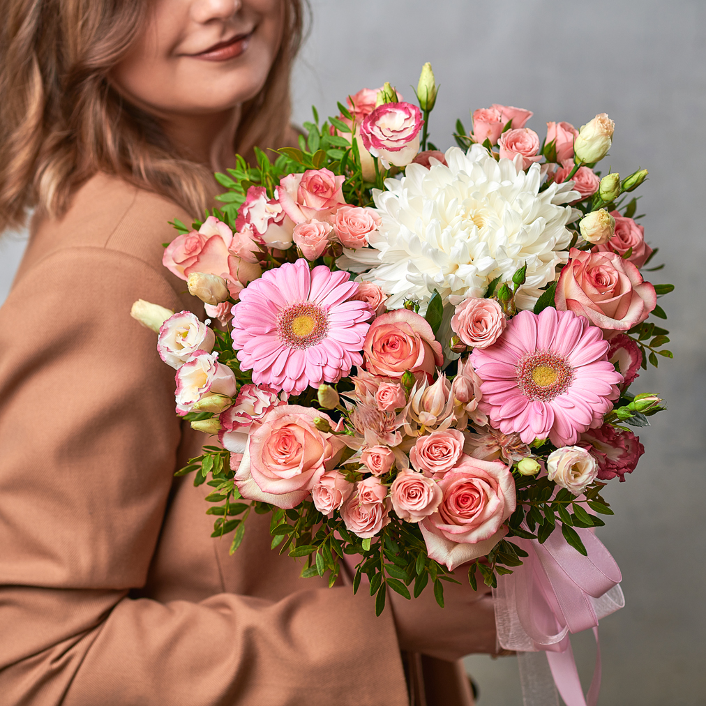 Купаж розовых соцветий с снежной хризантемой - подарок, который стоит преподнести по поводу и без. Возможны небольшие изменения элементов. Общий вид и композиция букета будет сохранена.