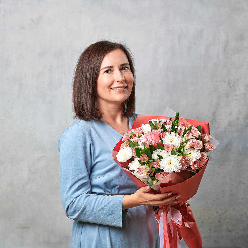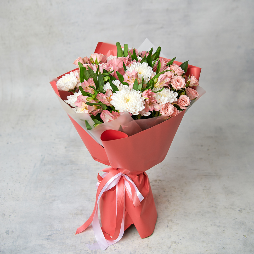 Снежные звезды в розовой реке - букет, который запомнится надолго. Пышные соцветия хризантемы, подчеркнутые нежной розой - сочетание, которое точно будет приковывать взгляды.Возможны небольшие изменения элементов. Общий вид и композиция букета будет сохранена.