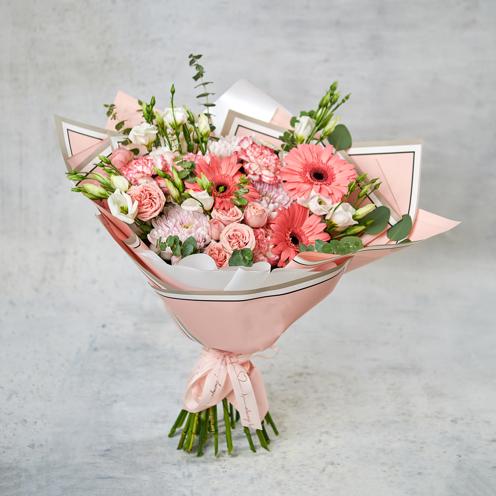 Симфония розового цвета, мечтательный и незабываемый букет станет отличным подарком для ваших любимых. Возможны небольшие изменения элементов. Общий вид и композиция букета будет сохранена.